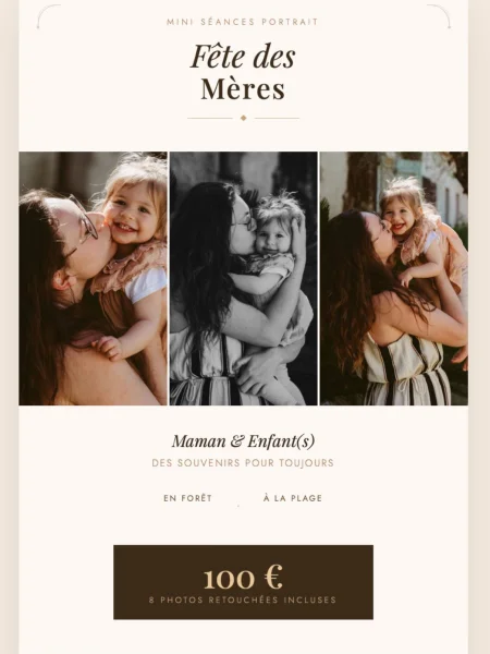 Offrir une séance photo pour la Fête des Mères, c’est offrir un souvenir vrai. Une parenthèse douce, sans décor artificiel, simplement vous, vos enfants, et la lumière dorée du soir.