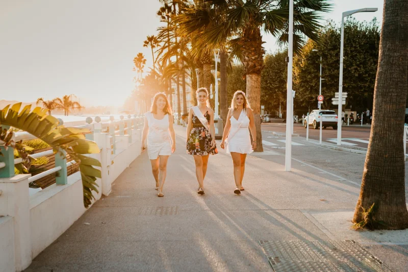 Pendant une séance photo EVJF à Cannes, l’objectif n’est pas seulement de poser, mais surtout de vivre un moment fun et spontané. Les participantes peuvent jouer avec l’eau, marcher sur le sable, se regrouper autour de la future mariée ou improviser des moments de danse et de fête.